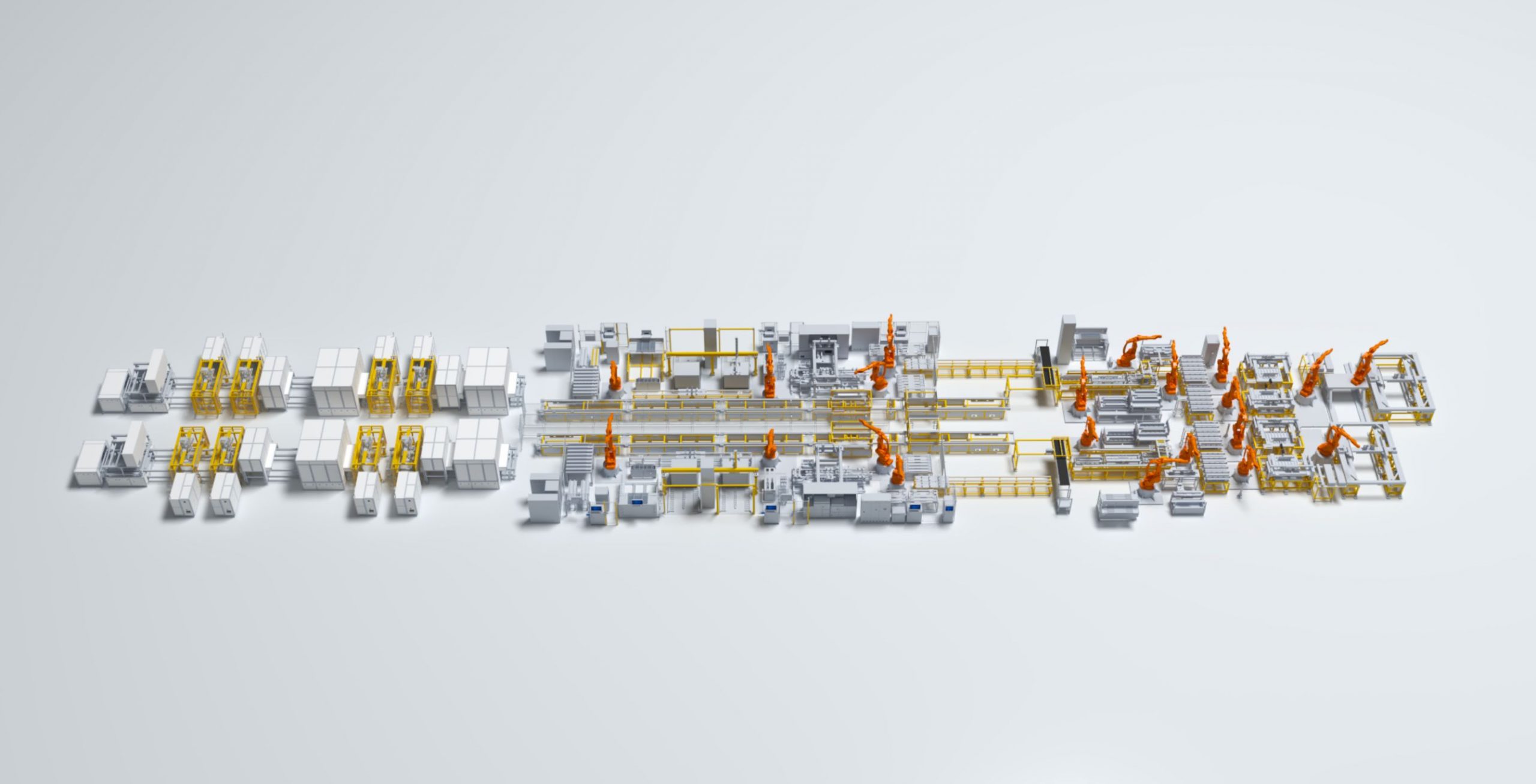 料框形式上料,产线自动拆垛,码垛料框。自动抓取电芯,变距台调整电芯间距进行电芯上线,扫码&OCV测试、NG替换,电芯贴胶、Beam成组,大面贴胶,水冷版粘贴,堆叠成不同大小的小单元,小单元堆叠成模组。