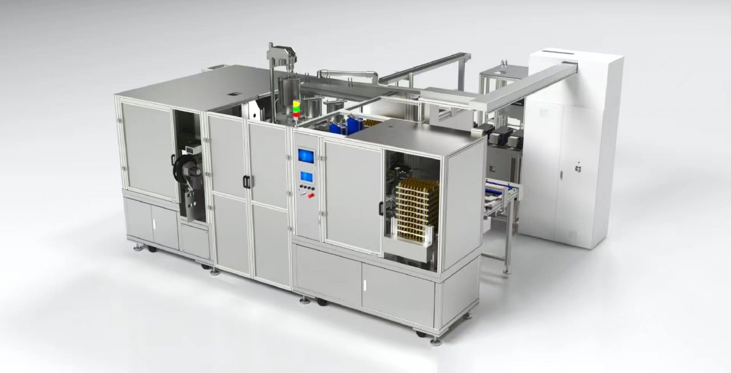 The immune reagent assembly and filling line for special-shaped chambers is driven by a servo motor, featuring a precision circular track and tray for automatic stainless-steel strip feeding. It includes QR code laser engraving, multi-chamber independent peristaltic filling, multi-chamber independent precision weighing, automatic sealing, laser film cutting, reject cutting, robot automatic correction and application of anti-evaporation film, automatic film pressing, automatic application of irregular labels, visual CCD detection, and sorting of good and bad products. This comprehensive equipment is capable of completing more than 30 product process flows.